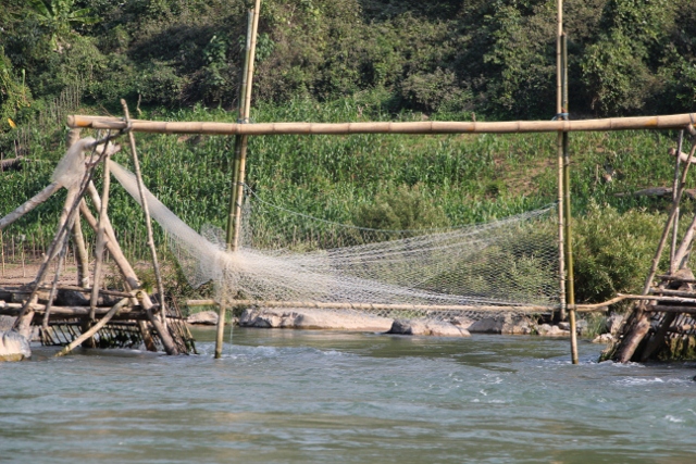 But I was going to tell you about how nice this trip was. There’s lots of activity on the river, first and foremost fishing, off course. Nets everywhere, and small canoes moving in between them, checking, re-setting. Then there is the weed business. Weed? Laos? But it is not what you think, I am talking about river weed: a large part of the population seems to be involved in collecting this, people standing up to their waists in the water and scraping the rocky bottom, especially around the rapids, for long, green, slimy weeds, which are happily put over a shoulder, or in baskets and canoes. The weed is later dried and fried, and makes a good snack (we tried it earlier, in Luang Prabang). Other types of business involve gold panning, and some form of gravel winning, perhaps, the structures look too big for catching nuggets.