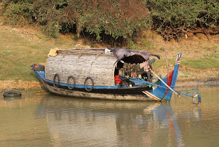 But back to the trip, which was a whole new experience. We boarded our boat at the jetty in Phnom Penh, in the Tonle Sap River, which joins the Mekong a little further downstream. The Mekong is a lot bigger here, and supports much bigger vessels – but still the small fishing canoes, as well. Most transport goes downstream, so whatever goes that direction is low, extremely low, in the water. Rice, mainly, in open boats, which have been heightened with sacks – also filled with rice – to allow a bigger pay load. It is a miracle that this rice doesn’t flush away with the first waves from other passing ships. But for the rest this part of the river isn’t particularly interesting. Yet I all the time have to think of the story told by Jon Swain, in his book Rivers of Time about the 1970s in Indochina. He traveled from Saigon to Phnom Penh early 1975, when Phnom Penh was under siege from the Khmer Rouge and the only life line for the city was food imports from an American air bridge, and daredevil boat captains who sailed up the Mekong. Jon was on one of those boats, and describes the shelling of his boat by Khmer Rouge artillery from the protection of the jungle, just before reaching Phnom Penh. As he tells it, you really feel vulnerable, but I reckon, as long as you stick to the middle, you should be pretty safe, given the width of the river here. But I am not an artillery expert, of course. And I wasn’t there at the time.